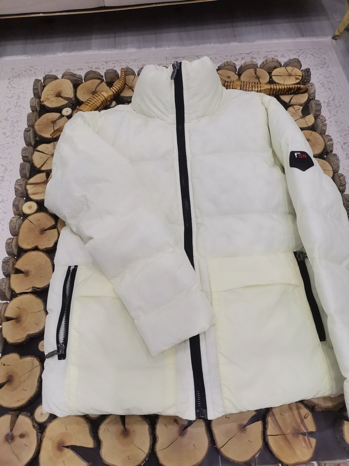 Beyaz renkli, yüksek yakalı ve uzun kollu kadın kışlık mont, yumuşak ve sıcak kumaştan, kürk detaylıdır. Fermuarlı cepleri ve midi boy kesimiyle şık ve rahat bir görünüme sahiptir. ❄️