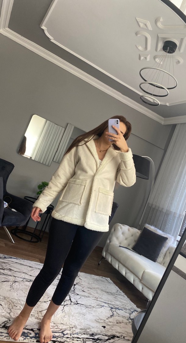 Beyaz Kadın Kışlık Peluş Detaylı Ceket