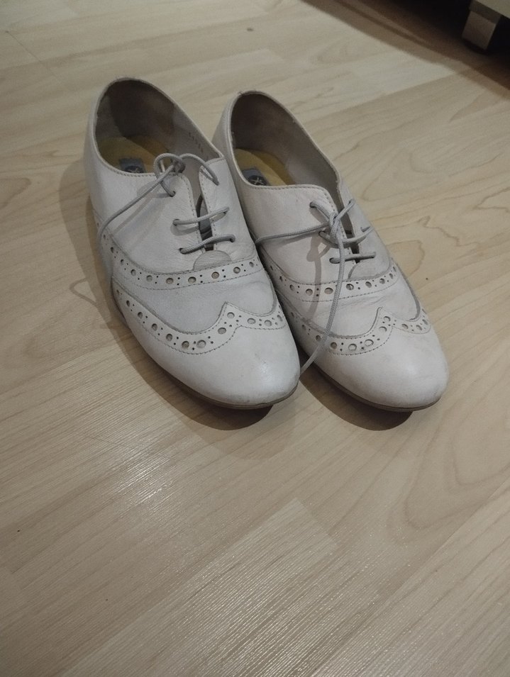 Beyaz renkte, dolgu topuklu kadın klasik ayakkabılar. Düz tasarımlı ve bağcıklı, yumuşak kauçuk görünümlü malzemeden yapılmıştır. Günlük kullanıma uygundur.