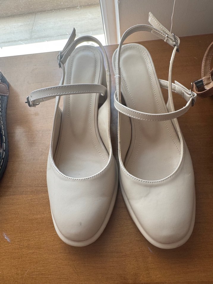 Beyaz, dolgu topuklu, tokalı kayışlı kadın klasik ayakkabı. Minimalist ve normcore tarzda, günlük kullanım için uygundur.
