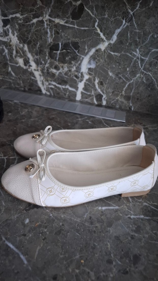 Beyaz dolgu topuklu kadın babet, parlak yüzeyli ve tokalı detaylı. Modern klasik tarzda, kauçuktan yapılmış, günlük kullanıma uygun.