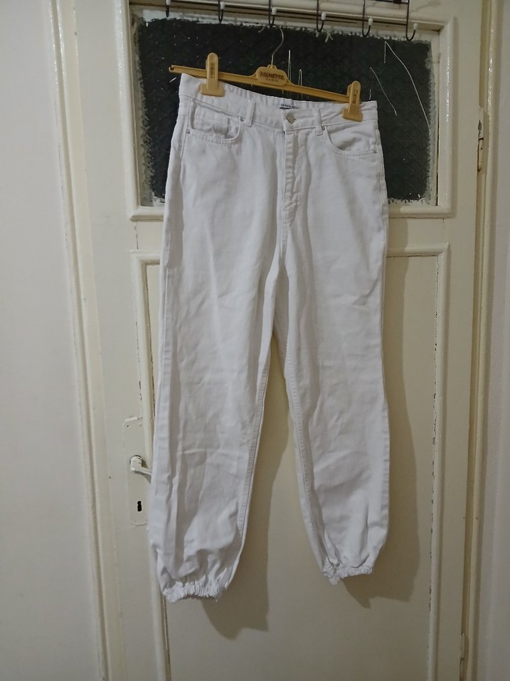 boyu 98 cm, bel kısmı 88 cmdir. paça kısmı lastiklidir. 30 bedendir Beyaz pamuklu kadın kot pantolon, bol kesim ve kemer detaylı. Midi boyda ve lastikli paçalarla sokak stiline uygun. #kotpantolon #jean #jeans