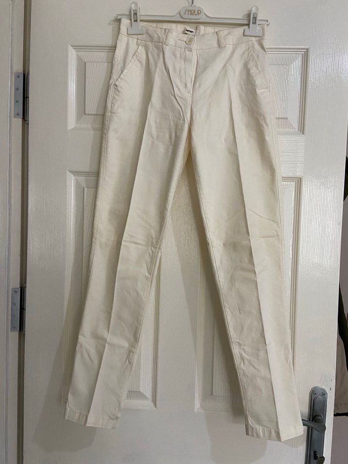 Beyaz pamuklu pantolon, normal kesim. Rahat, günlük kullanıma uygun. Bir iki defa giydim elimde başka pantolonlar olduğu için giymedim.