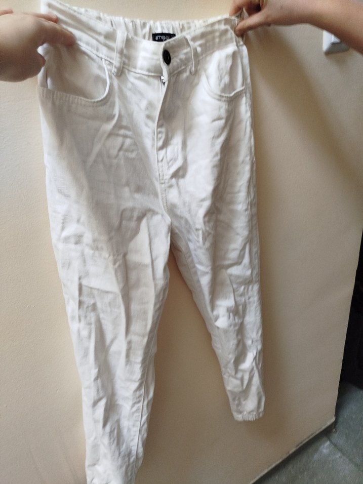 Normal i boy, beyaz kot kumaştan dar kesim pantolon. Parlak yüzeyi ve sade tasarımıyla günlük sokak stiline şıklık katıyor.
