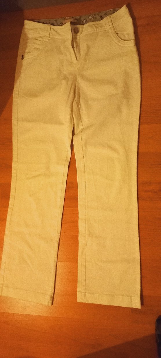 Bej renkli, düz ve parlak görünümlü, sentetik kumaştan yapılmış, normal boy kadın pantolon. Günlük kullanıma uygun.