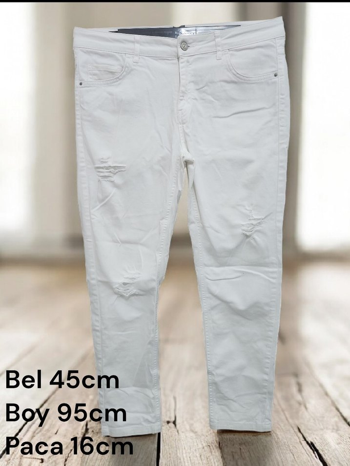 Beyaz, pamuklu, regular fit midi uzunlukta kadın kot pantolon. Günlük sokak stili için uygun, desensiz tasarım. Bel 45cm, boy 95cm, paça 16cm.