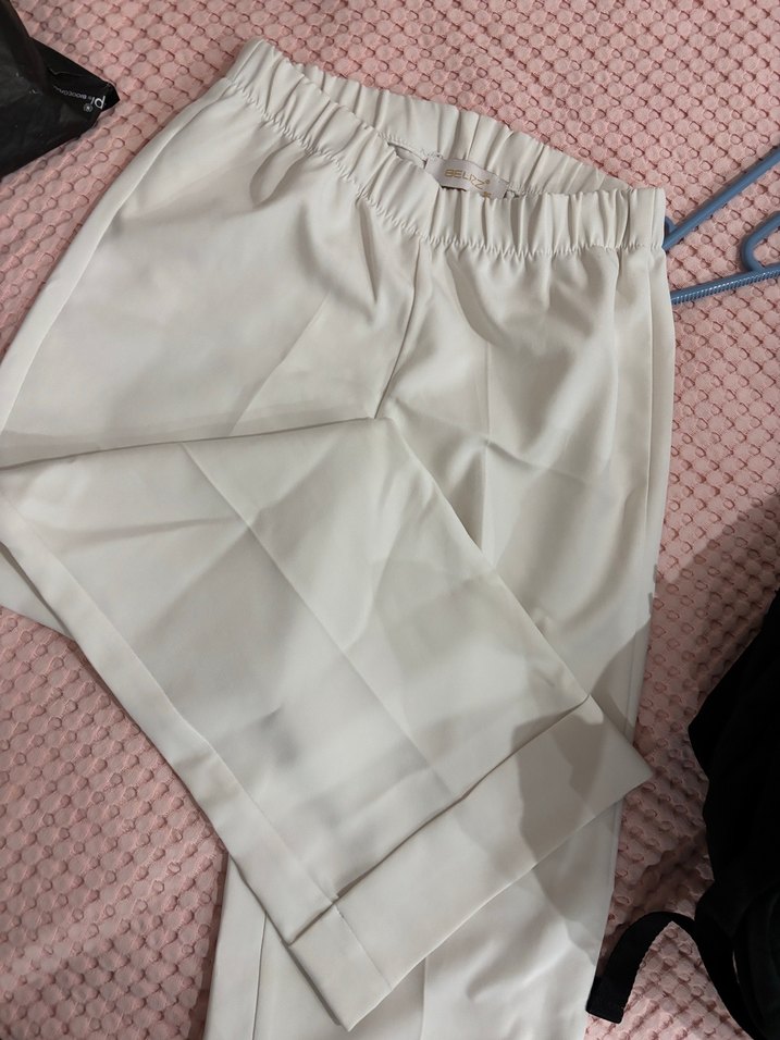 Beyaz, regular kesim kadın kumaş pantolon. Elastik bel bantlı, pürüzsüz sentetik kumaştan,ütüsüz oldugundan oturu boyle duruyor