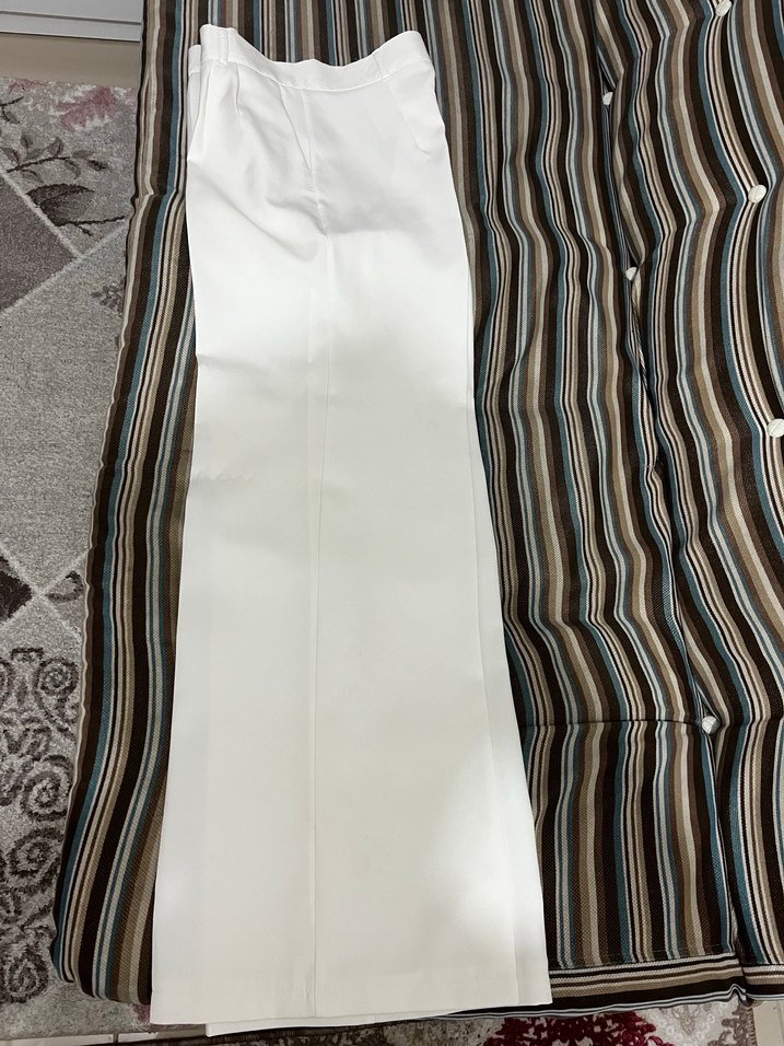 Kadınlar için uzun beyaz pantolon parlak sentetik kumaştan üretilmiştir beli olmadığı için satıyorum hiç giyilmedi trendyoldan almıştım