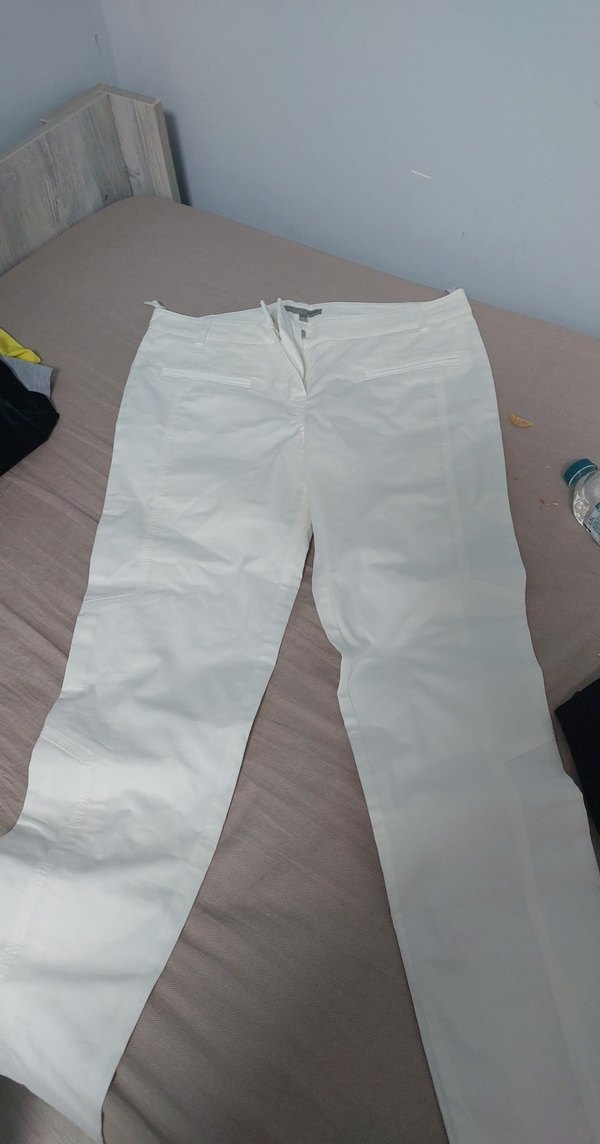 Beyaz, normal boyda, düz kesim kadın kumaş pantolon. Rahat sentetik kumaştan üretilmiş, gündelik dış mekan kullanımı için uygun, sade ve şık tarzda.