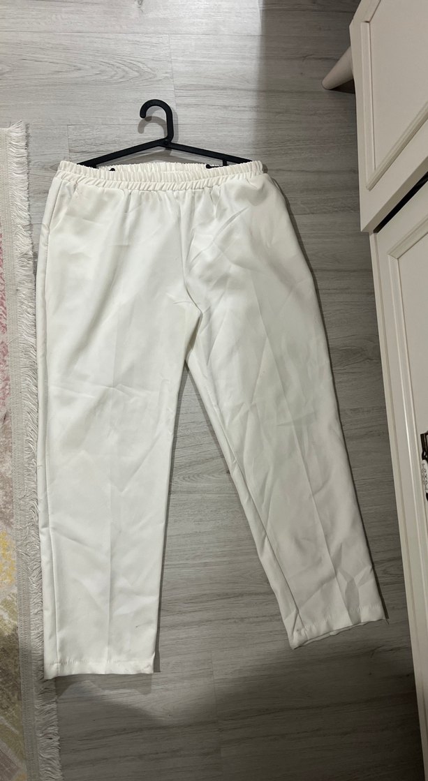Beyaz, düzenli kesim, midi boy kadın kumaş pantolon. Düz ve desensiz, sentetik kumaştan üretilmiş, günlük kullanım için rahat ve şık bir modeldir. Minimalist tarzda, sade ve kullanışlıdır.