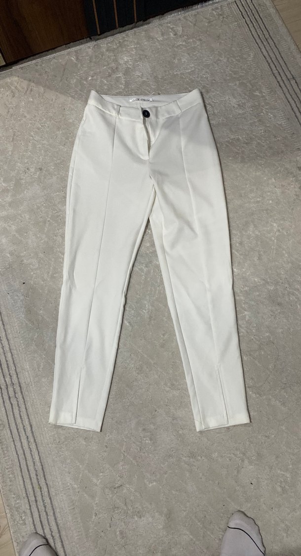 Beyaz, midi boy, düz desenli kadın kumaş pantolon. Rahat kesimi ve şık görünümüyle ofis kullanımı için uygundur. ✨36 bedene daha uygun kalıbı dar