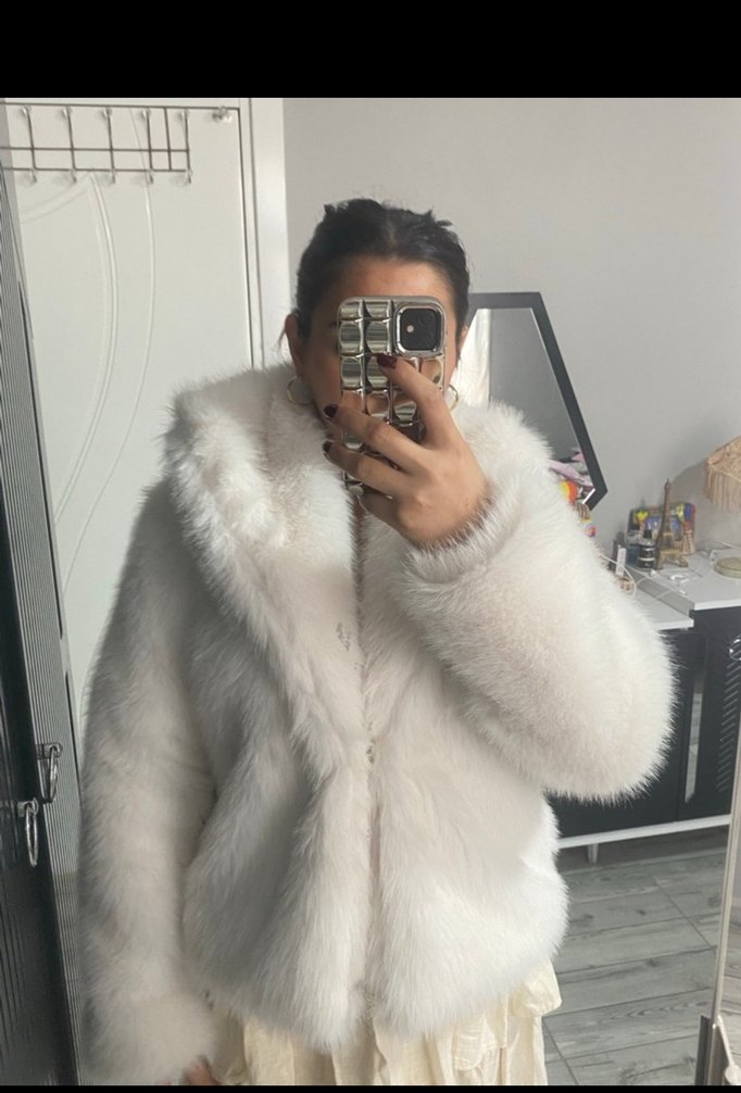Bu beyaz kürk detaylı, uzun kollu ve yumuşak fleece kumaştan yapılmış midi uzunlukta, dar kesim ceket sokak stili ile avant-garde tarzını birleştirir.