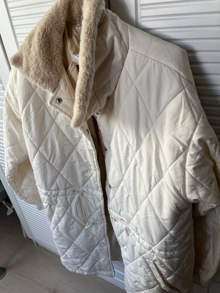 Beyaz renkte, kürklü yakalı ve kapitone desenli kışlık ceket. Bol kesim, çıtçıtlı ve midi boyda, rahat ve sıcak kumaştan üretilmiştir.