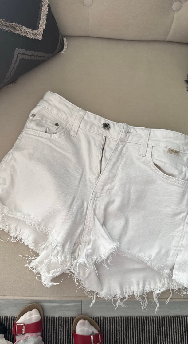 Pamuklu, beyaz renkli, bol kesim mini kot şort. Kenarları tırtıklı, rahat ve günlük sokak stili için uygun. Effortless chic tarzı sunar.