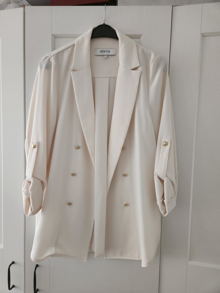 Beyaz renkte, düğmeli, yakalı, uzun kollu midi blazer ceket. polyester kumaştır. klasik zarafetiyle ofis şıklığı sunar. ✨