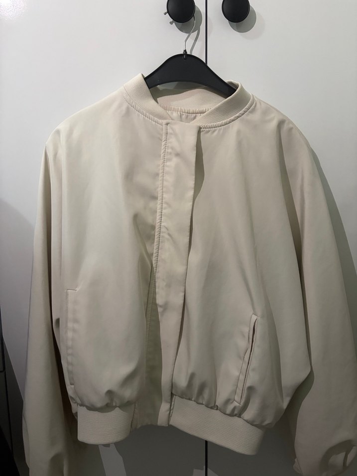 Yüksek yakalı, uzun kollu ve bol kesimli beyaz kadın ceket. Düz, pastel tonlarda, ofis için uygun minimal ve rahat şıklık sunar.