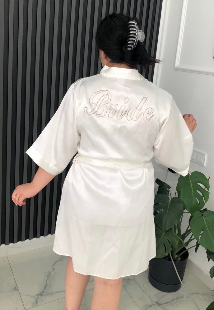 Sırtında "Bride" nakışlı, parlak beyaz, kısa kollu, bol kesim midi boy sabahlık. Minimalist ve bohem tarzda.