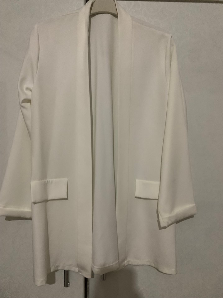 Beyaz renkte, notlu yakalı ve uzun kollu kadın midi boy ceket. Düz, sade tasarımıyla ofis için uygun, sentetik kumaştan üretilmiştir.