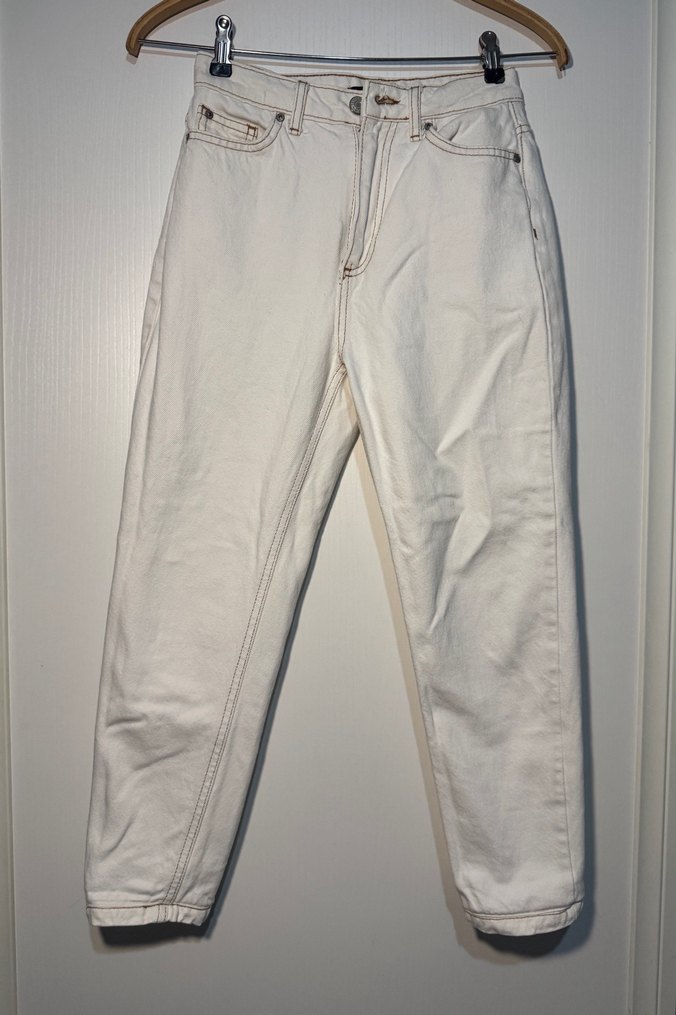 Beyaz pamuk kot pantolon, regular fit ve midi boyda, minimalist sokak stili için uygun. Düz ve desensiz tasarımıyla günlük kullanıma uygun, zahmetsiz şıklık sunar.
