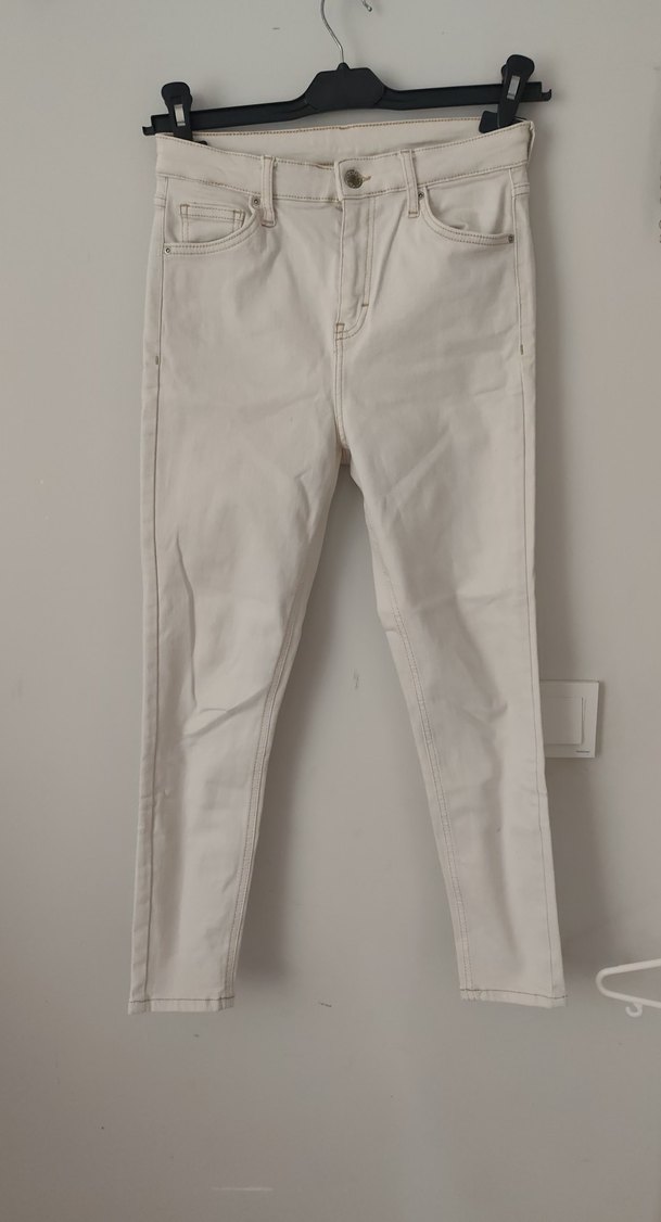 Yumuşak pamuk kumaştan, normal kesim ve midi boy beyaz kadın kot pantolon. Desensiz, minimalist ve normcore tarzıyla günlük kullanıma uygun şık bir model.