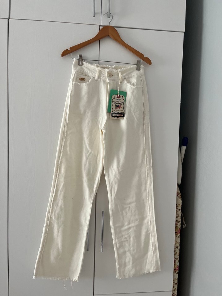 Beyaz pamuklu, midi boy ve regular fit kadın jean. Günlük kullanıma uygun, rahat sokak stili ve zahmetsiz şıklık sunar.