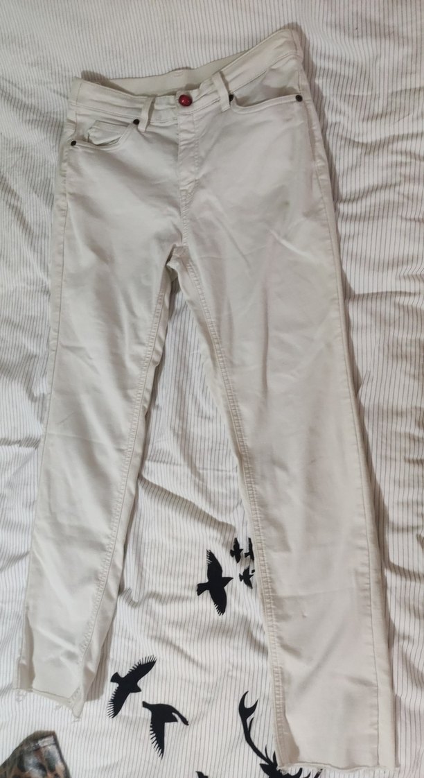 Beyaz, midi boy, kadın kumaş pantolon. Rahat kalıp ve düz tasarımıyla günlük sokak stiline uygun. yurt dışı ürünüdür