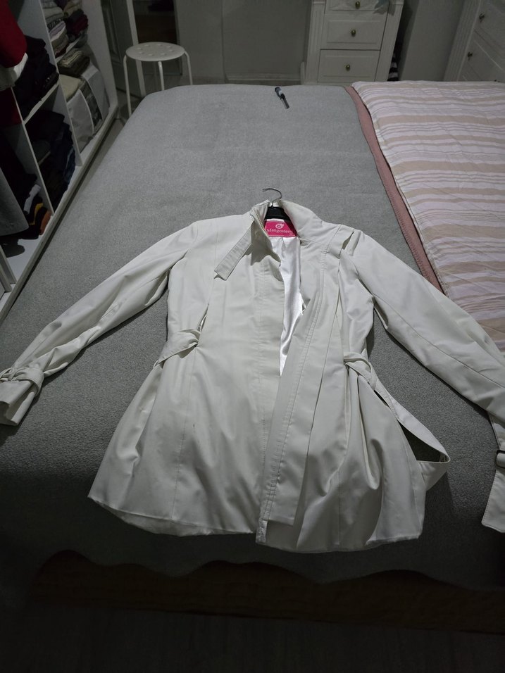 Beyaz midi uzunlukta, kemerli ve kesimli kadın trençkot. Sentetik kumaştan, uzun kollu ve yakalıdır. Ofis için uygun sade tasarım.