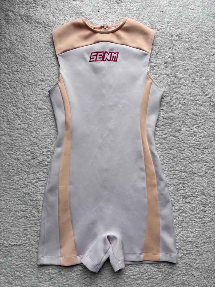 Kolsuz, beyaz ve pastel yan panelli, fermuarlı sırt detaylı, spor ve şık midi tulum. Straplez yakaya sahip. sbnn gny marka