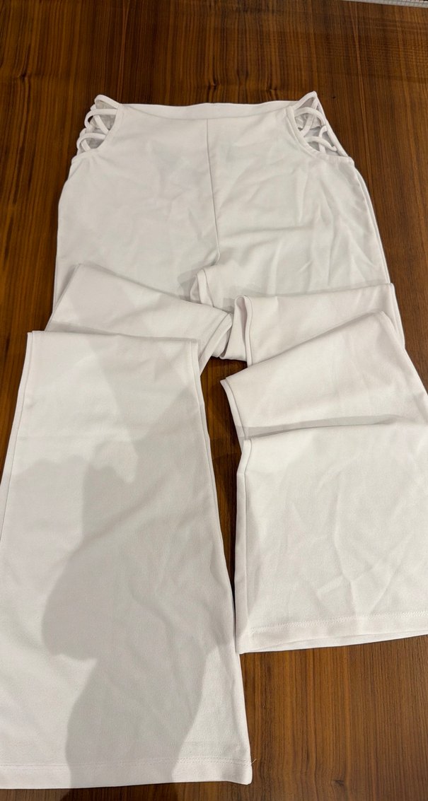 Kadınlar için beyaz midi pantolon, düzenli kesim ve elastik bel ile rahatlık sağlar. Düz sentetik kumaştan, minimalist sokak stiline ve dış mekan kullanımına uygundur.