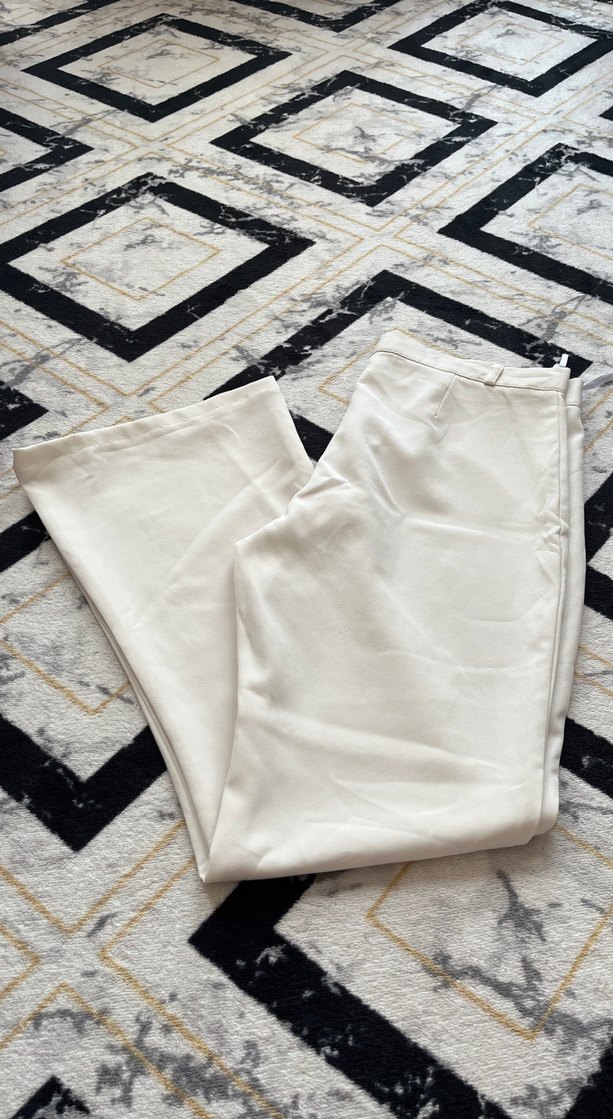 Beyaz midi uzunlukta, regular fit kesim ve yumuşak sentetik kumaştan üretilmiş, ofis için uygun şık pantolon. 1 kez giydim bedeni olmadığı için satıyorum deformesi yoktur uzunluk 100 cm paça genişliği 27 cm beli 80 cm
