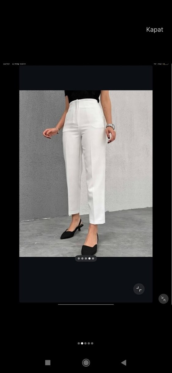 Beyaz, midi boy, regular kesim kadın pantolon. Pürüzsüz sentetik kumaştan, ofis için sade ve şık tasarım yeni etiketi üzerinde