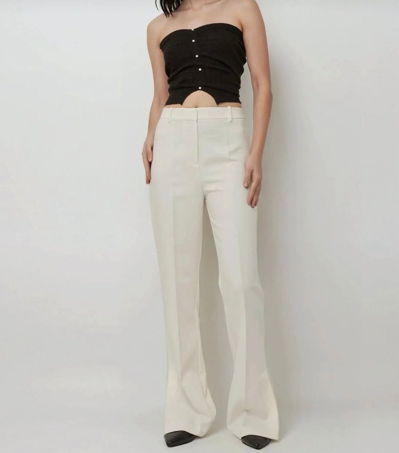 Beyaz midi uzunlukta, düz kesim kadın pantolon. Pürüzsüz sentetik kumaştan, ofis için rahat ve şık normcore tarzda. Son fiyat. Marka temsili değil