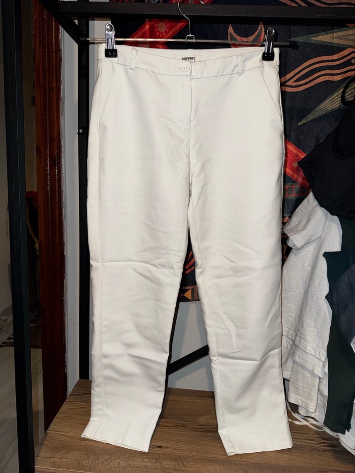 Beyaz midi boy kumaş pantolon, regular fit. Ofis için rahat ve şık bir görünüm sunar.