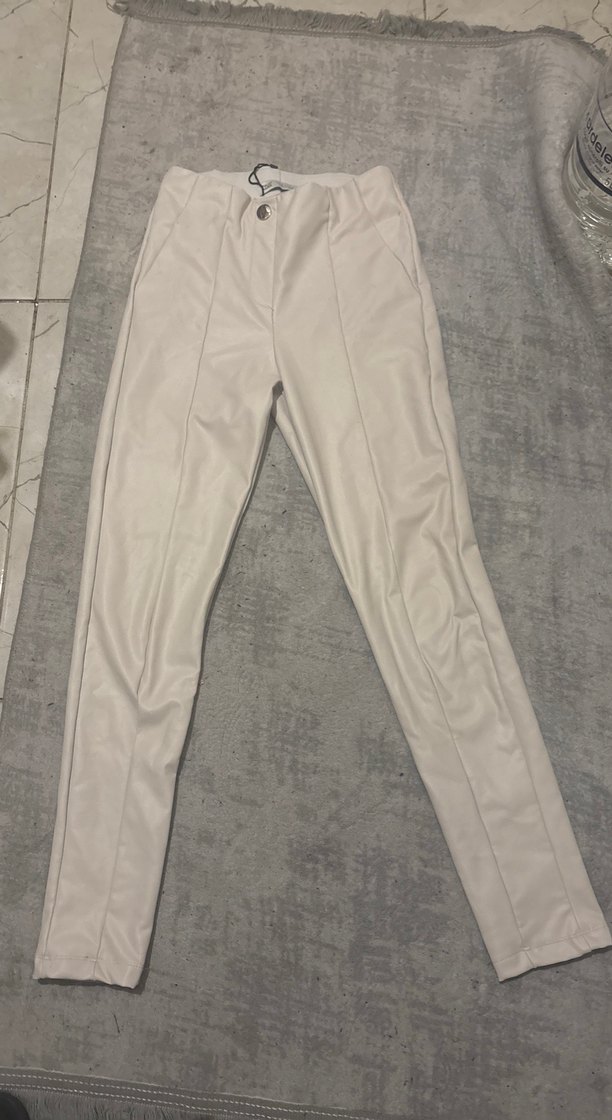 Beyaz renkte, sentetik kumaştan yapılmış, midi boy ve regular fit kadın pantolon. Desensiz tasarımıyla günlük şıklık sağlar. Beyaz deri pantolon minik deri atması görsellenmiştit