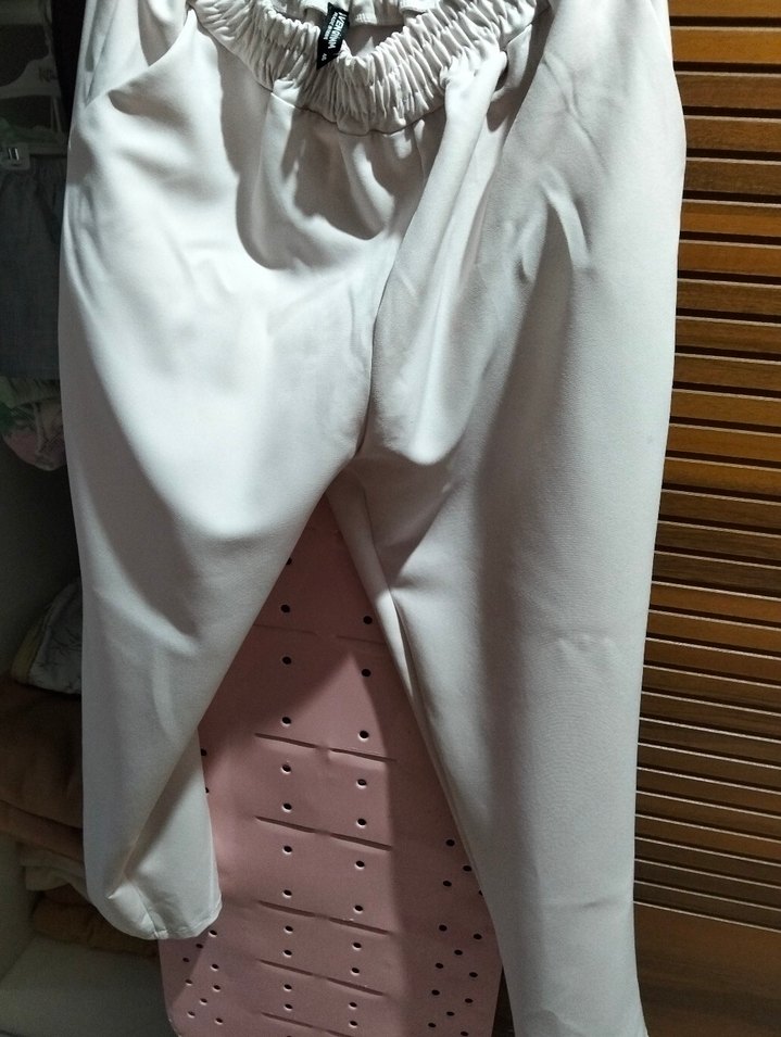 Düz beyaz, regular fit midi pantolon, yumuşak sentetik kumaştan, yanında yırtmaç detayıyla. Sokak stiline uygun, trend casual tarzda.