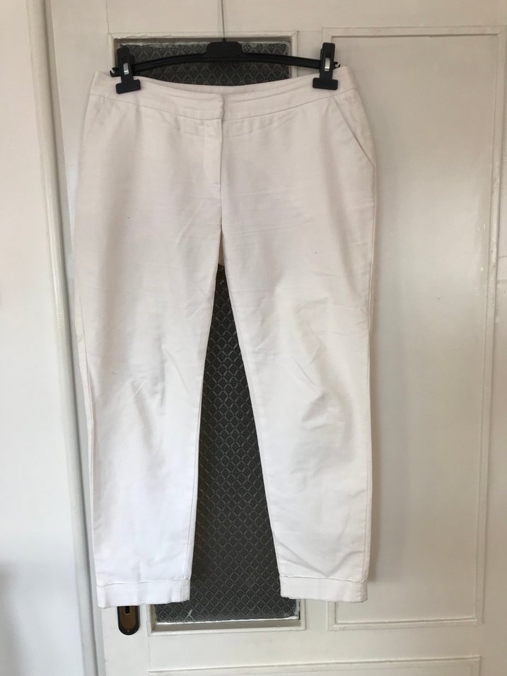 Beyaz pamuk kumaştan, normal boy midi kesim ve regular fit olan bu pantolon, minimalist normcore tarzıyla ofis için şık ve rahat bir seçimdir.