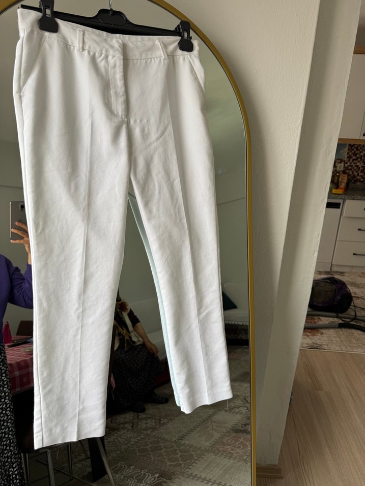 Beyaz pamuk kumaştan, normal boy midi pantolon. Rahat kesimi ve sade tasarımıyla ofis için uygun, hafif ve şık kumaş.