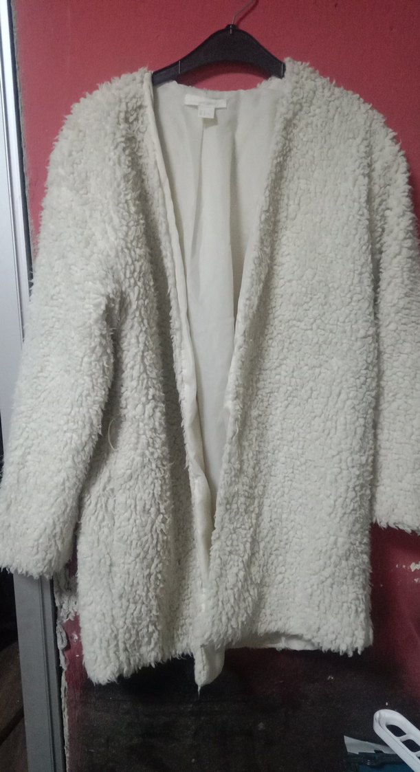 Beyaz renkte, peluş kumaştan, kürk detaylı, uzun kollu, normal boy midi kadın kaban. Gevşek kesim ve notched yaka ile günlük kullanım için uygundur.