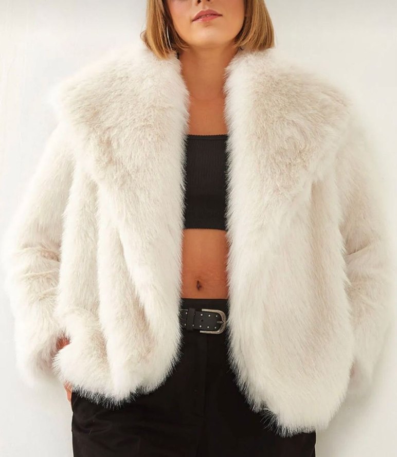 Bu beyaz suni kürk ceket, kesik yaka ve uzun kollu bol kesimiyle rahat ve cesur bir sokak stili sunar. Midi boyda ve yumuşak peluş dokuludur, günlük kullanım için uygundur.