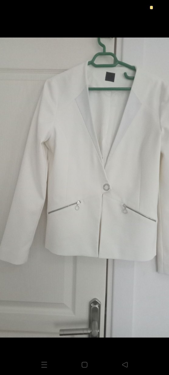 Beyaz renkli, düğmeli ve fermuarlı ceplere sahip kadın mini blazer ceket. Uzun kollu, klasik kesim ve sentetik kumaştan üretilmiştir. Ofis şıklığı için uygundur.