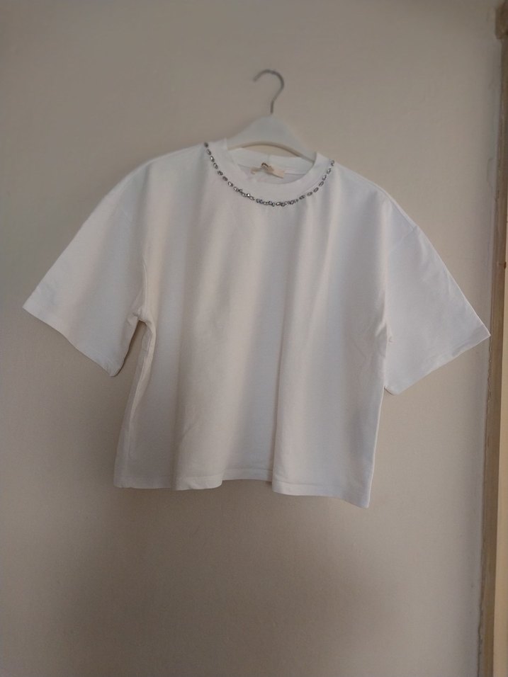 Pamuk kumaştan, kısa kollu ve yuvarlak yakalı beyaz kadın mini crop tişört. Salaş kesimi ve sade tasarımıyla günlük sokak giyimine uygun.