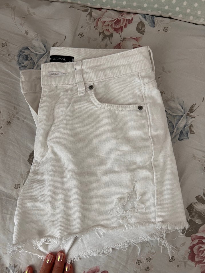 Beyaz mini denim şort, bol kesim ve düğmeli kapanışlı. Püsküllü kenar ve hafif yıpratma detaylarıyla günlük sokak stili için uygun.