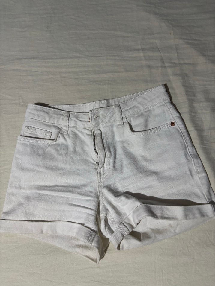 Pamuklu kumaştan yapılmış, sade ve desensiz, günlük rahat sokak stili için uygun beyaz mini fit kesim şortlar.