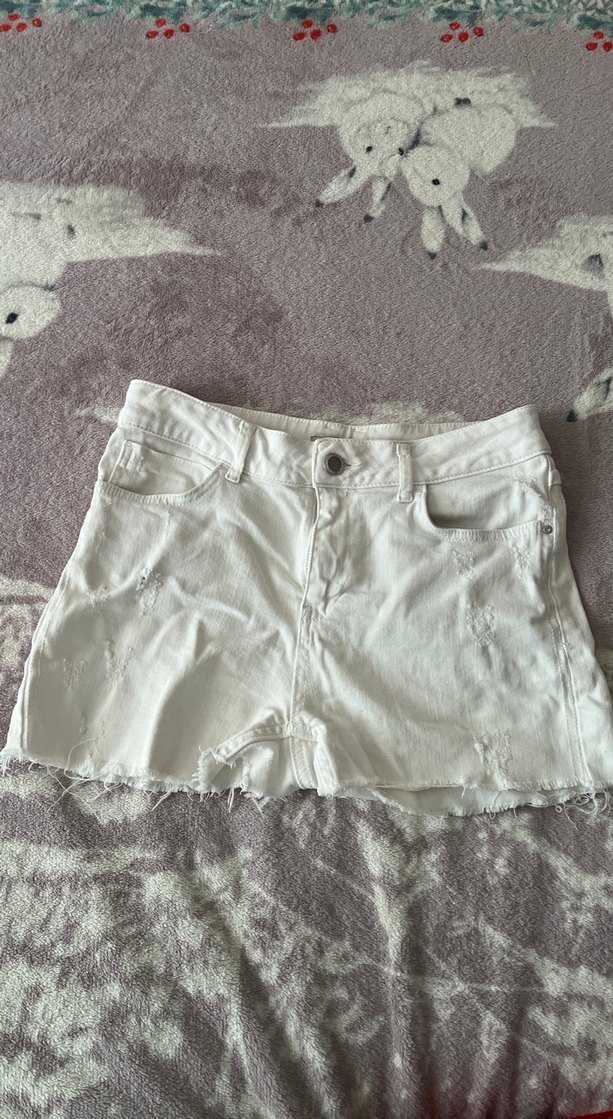 Pamuklu beyaz mini denim şort, bol kesim ve düzensiz kenar detaylı. Günlük kullanım için rahat ve şık bir sokak stili parçası.