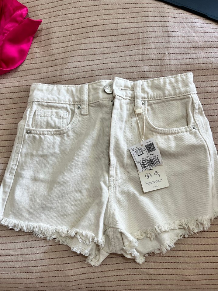 Pamuklu kumaştan, bol kesim ve yırtık detaylı beyaz mini denim şort. Günlük kullanıma uygun, rahat ve şık sokak stili için ideal.