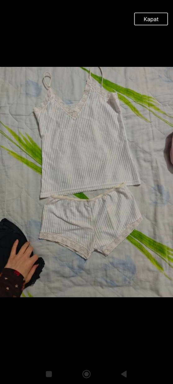 Beyaz, kolsuz mini pijama takımı, vücuda oturan üst ve şortlardan oluşur. Yumuşak kumaşı ve sade tasarımıyla rahat ve konforludur.