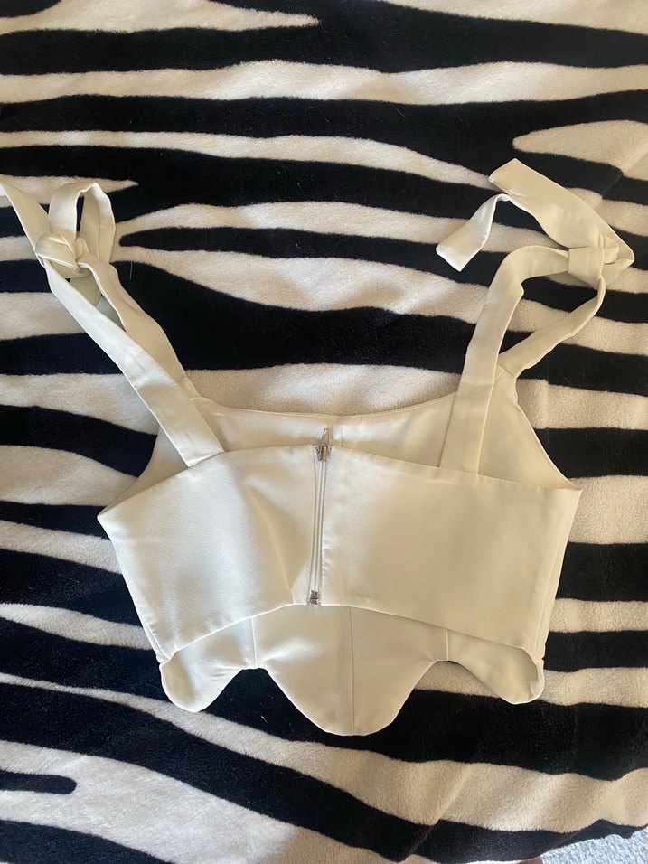 Beyaz, sentetik kumaştan üretilmiş, önden fermuarlı ve askılı kısa bustiyer. Sıkı kesimi ve sokak modasına uygun tarzıyla günlük kullanıma uygundur. Ürün boyu 25 cm
