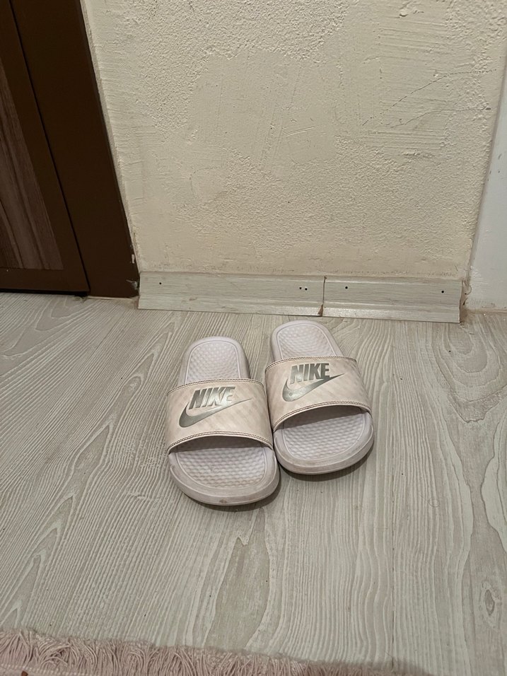 Beyaz kadın Nike terlik, dolgu topuklu ve tokalı bantlı. Minimalist, sade tasarım, günlük sokak kullanımı için uygun. Kauçuk malzemeden yapılmıştır.