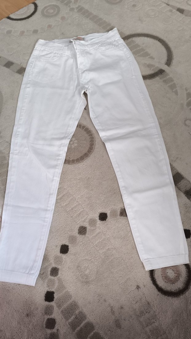 Beyaz pamuklu kumaştan, normal kesim ve midi boy kadın pantolon. Günlük kullanım için rahat ve şık sokak stili sunar.
