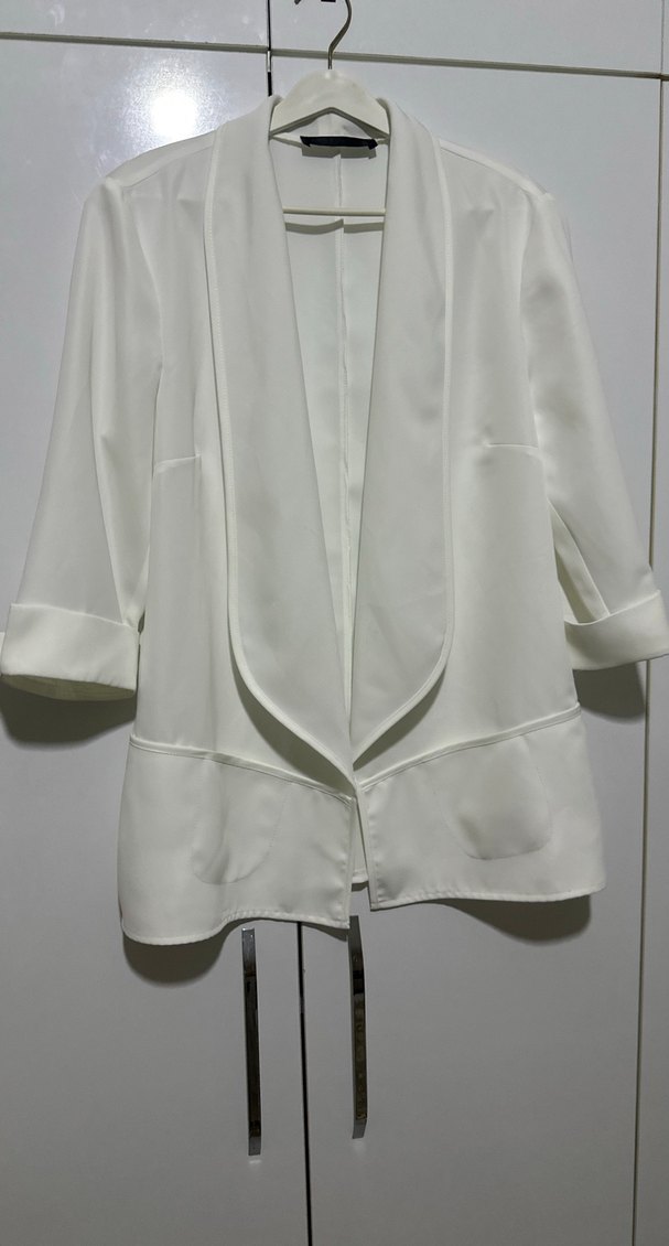 Beyaz renkli, kısa kollu kadın blazer. Düğmeli, normal kesim ve midi boyda, ofis kullanımı için uygundur. Sentetik kumaştan üretilmiştir.